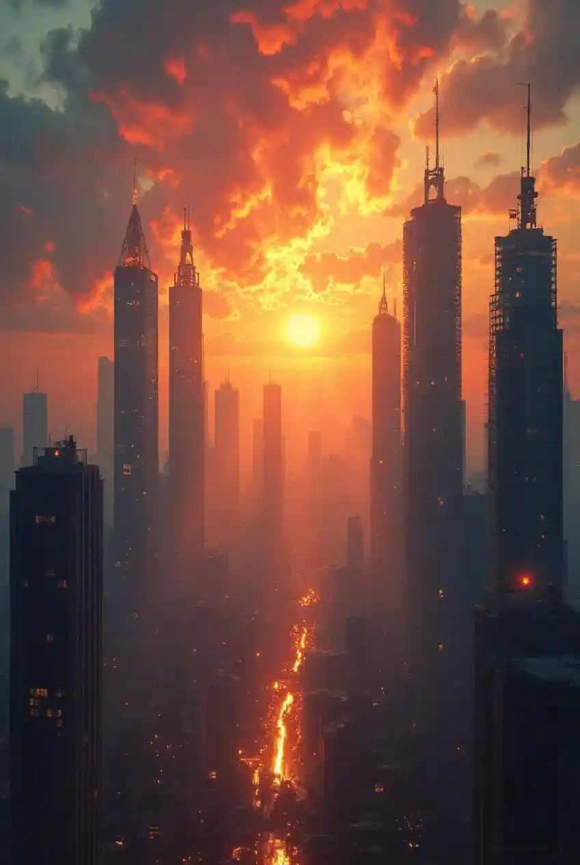 Surreal Dreamscape: Skyscrapers and Sunset Fire