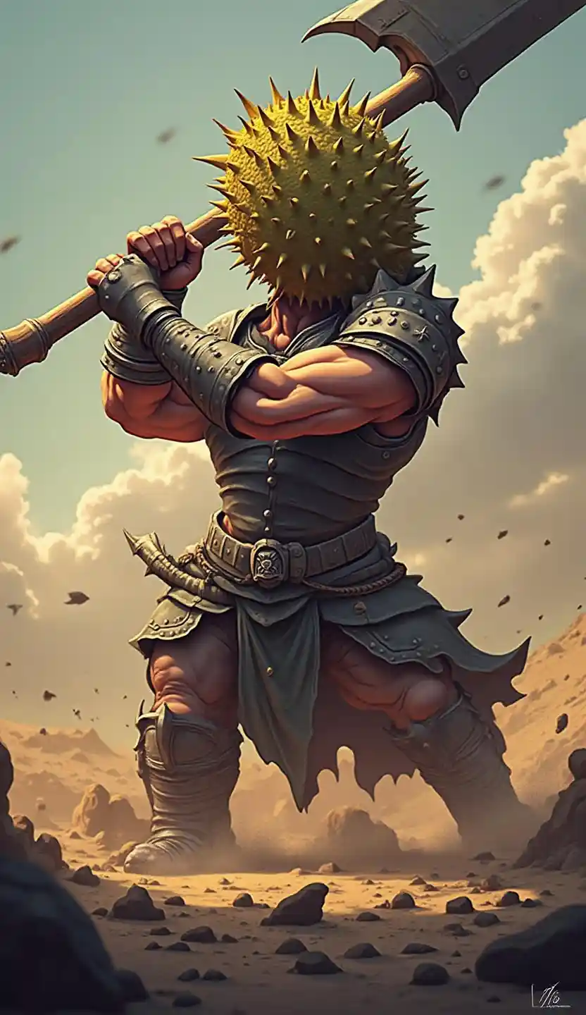 stxph"Dynamic digital illustration, cinematic framing: A muscular, fierce warrior swings a medieval-style mace weapon, its head replaced with a large spiky durian fr