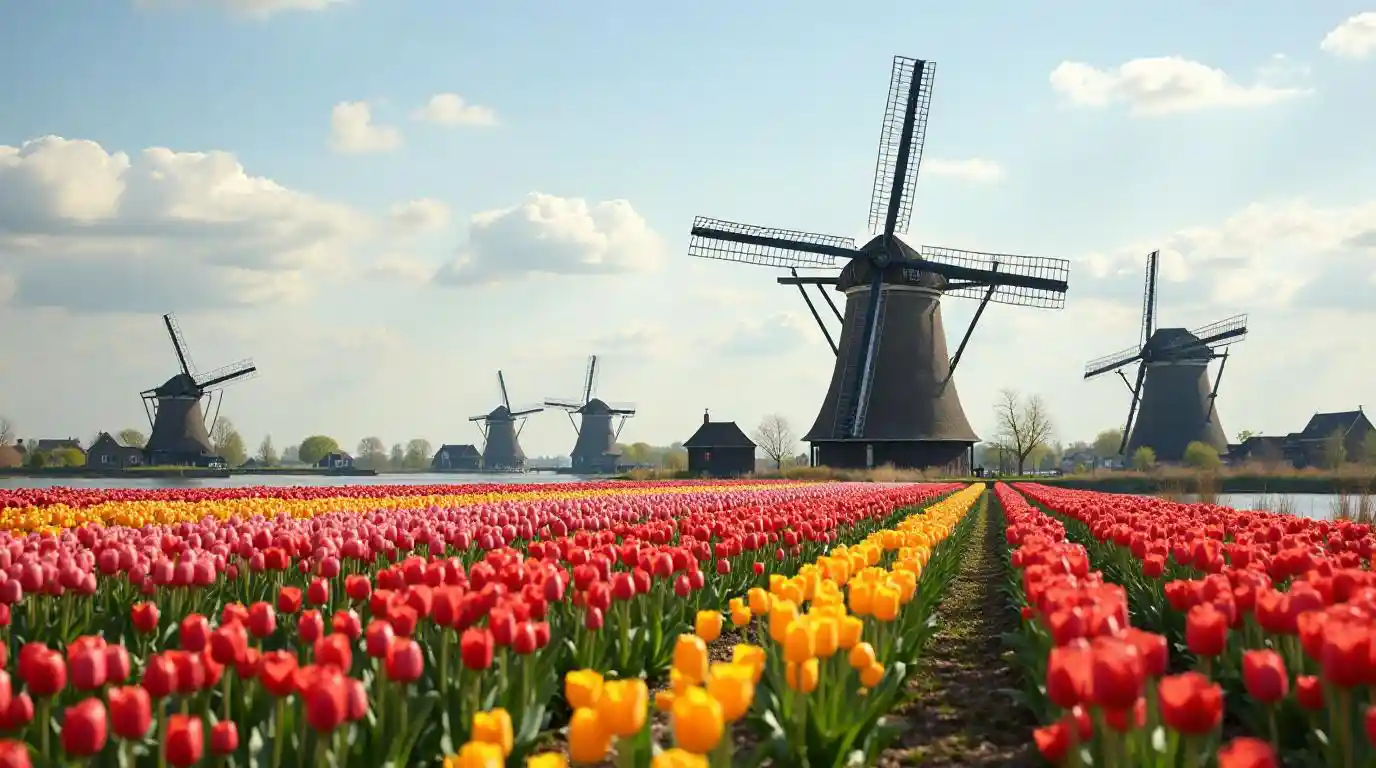 JaceA Dutch town with windmills turning slowly beside tulip fields.