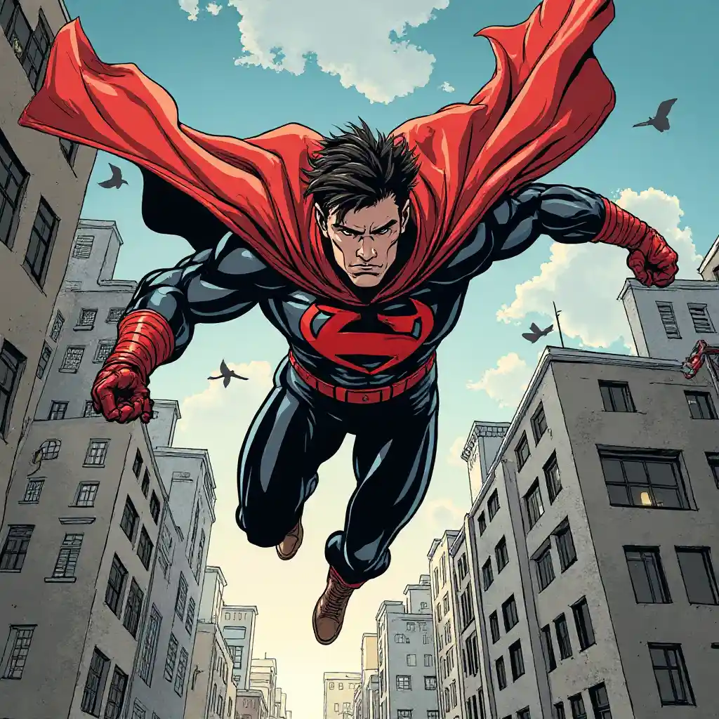 JaceComic Art, A dynamic superhero in action, flying through a cityscape