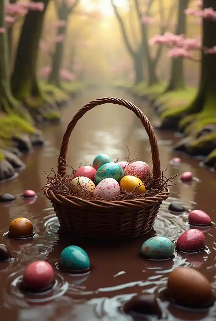 a basket of beautiful easter eggs floating on a river of chocolate, 4k, high resolution, photorealistic, intricate details, colorful, vibrant colors, realistic