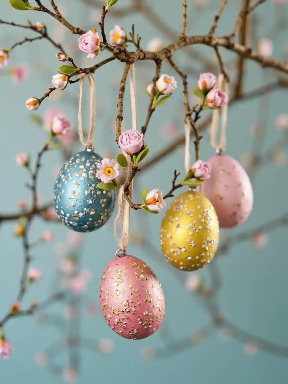 colorful easter eggs hanging on the twigs, with metallic effect, and different flowers on top of the egg