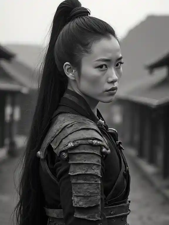 Woman, Samurai, Hime cut, long back hair, Japanese armor, serious face, monochrome photo style, retro, background is a village from the Edo period,