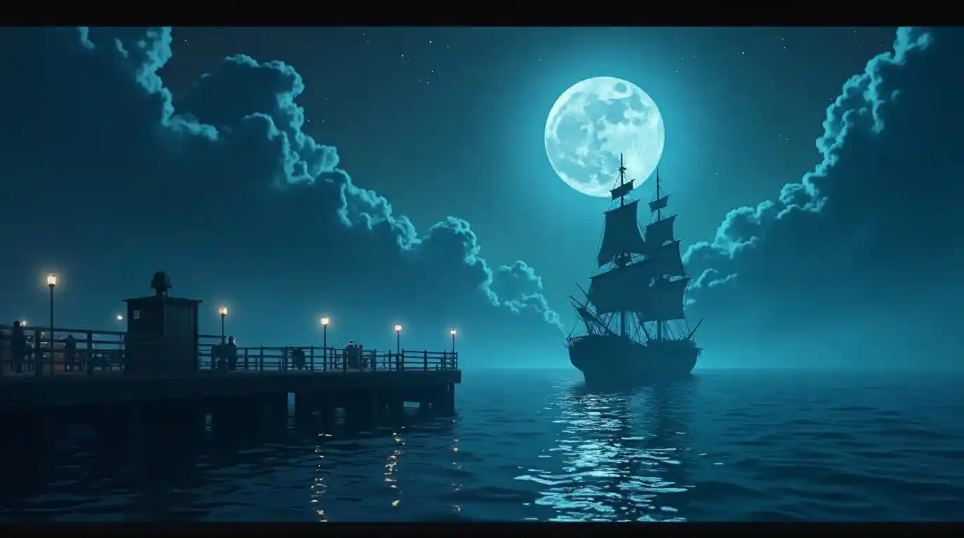 JackMoonlit pier, ghostly ships arriving, channeling eerie supernatural anime aesthetics.