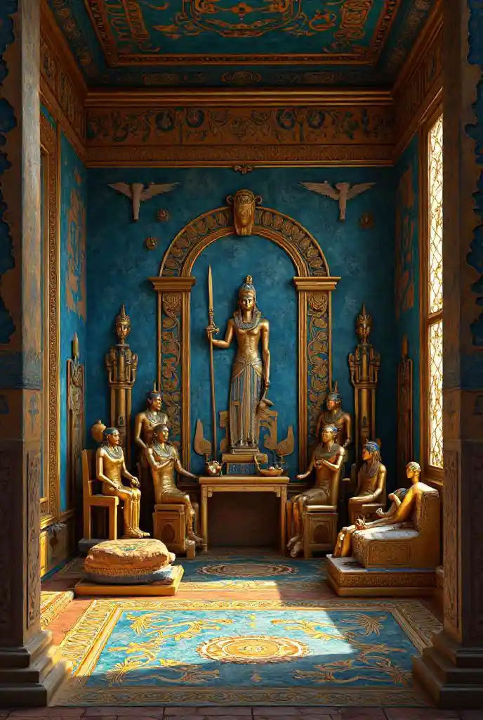 SkylarPharaoh's room decorated with golden Egyptian statuettes and blue paintings. Use only gold and blue. отличное качество, masterpiece, high detail