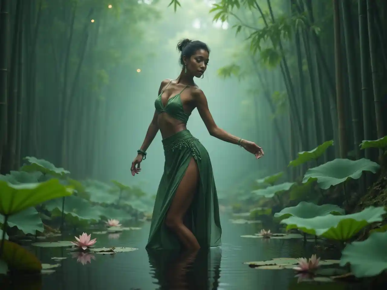 Dancing in a misty bamboo grove, a Black woman in her 25s captivates in a silk crop top and high-slit skirt with jade beads. Lotus ponds and fireflies frame her, her toned legs and low-cut top exuding serene elegance and seductive charm in a tranquil, natural setting.