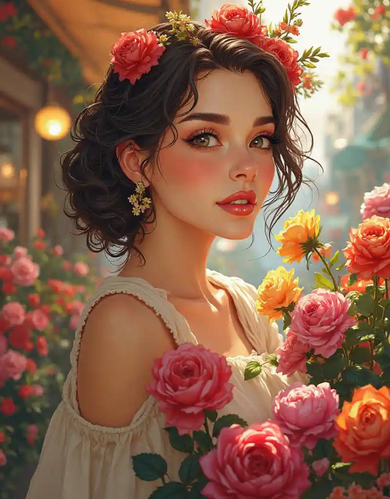 Vivid, highly detailed, award-winning illustration, professional. A woman, elegant and natural makeup woman looking at flowers at a flower market, sexy hot plat