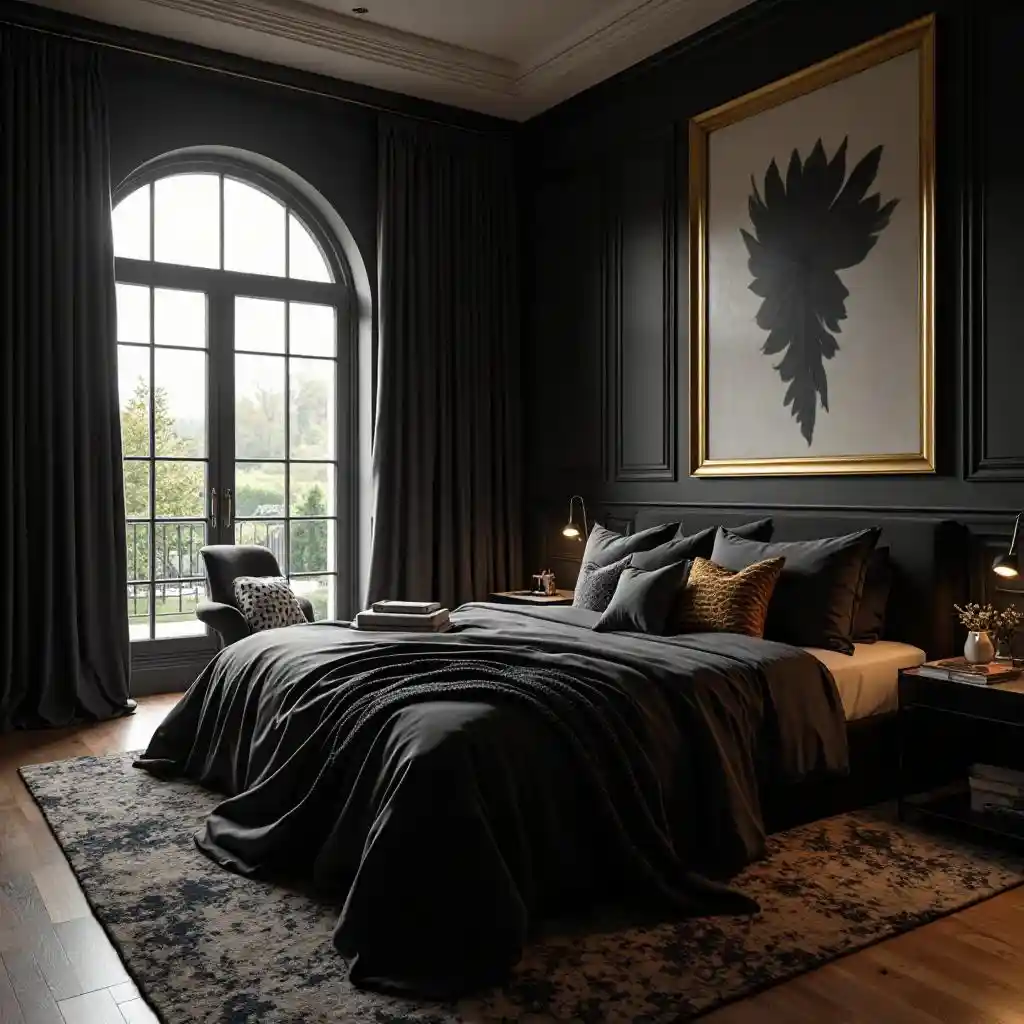 A luxurious home interior with an elegant design in black and gold tones. The room should feature high-end home textiles such as rich curtains, stylish bedding sets, and towels. The overall atmosphere should exude luxury and sophistication, with large windows, plush curtains, and a neatly arranged bed. The black and gold tones should harmonize, creating a sense of exclusivity and elegance. Ensure that no text, logos, or cleaning elements (such as chemical products) are visible in the image. The focus should solely be on the beauty of the home textiles, leaving space for promotional text to be added later on a transparent background. The promotion will highlight a 25% discount on home textiles every Friday evening until December 31st."