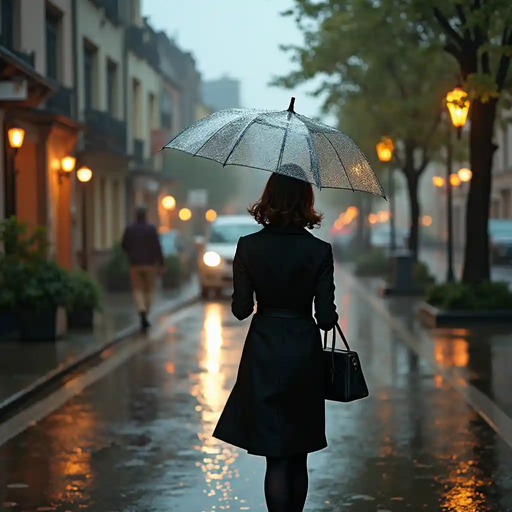 An Elegant Lady Walking in the Rain with Umbrella