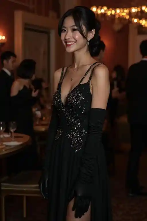 HudsonA Japanese woman smiles shyly at a party wearing an all-black outfit consisting of a long embellished dress with a slit on one side, long opera gloves, pantyhos
