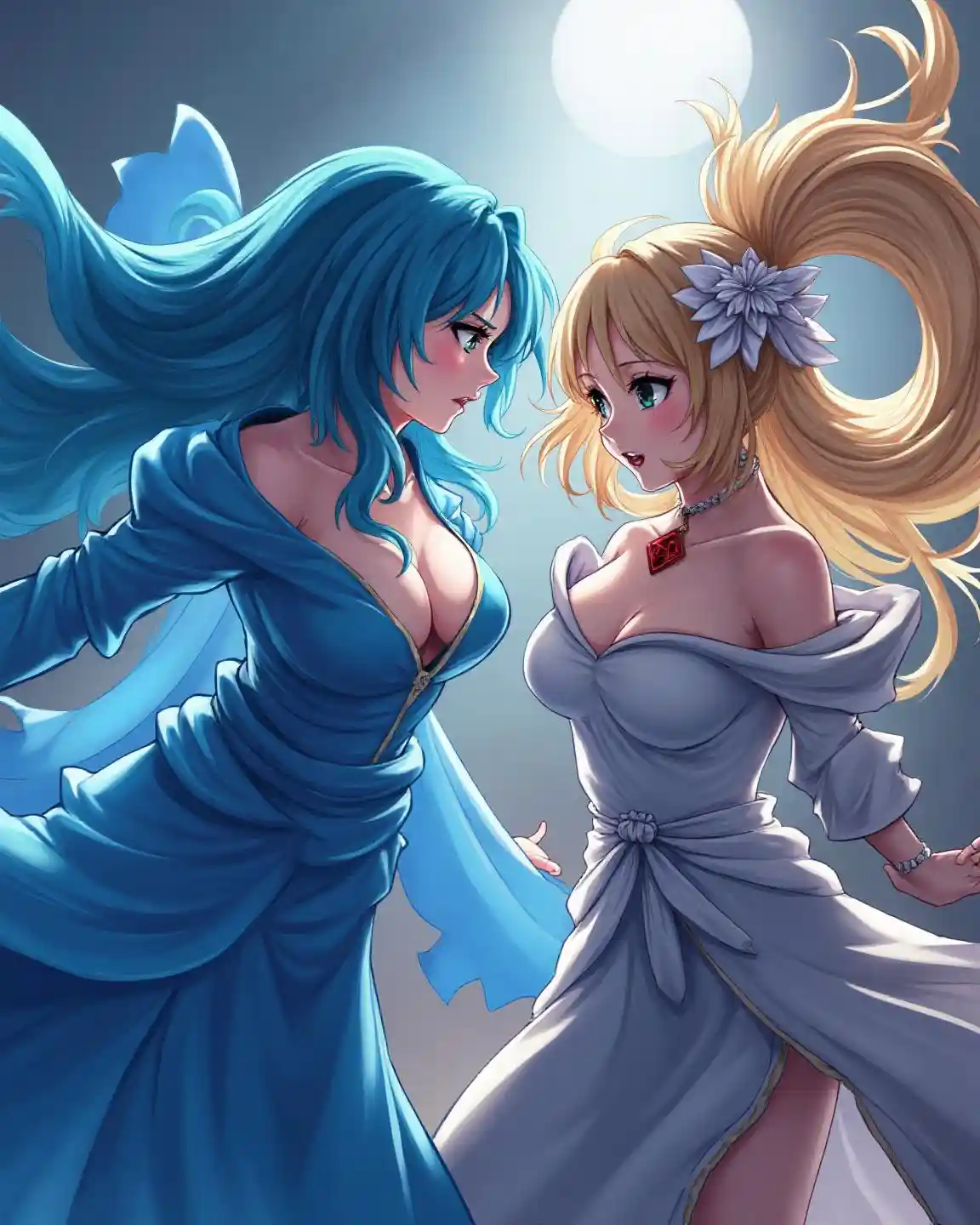 two powerful anime-style beautiful women locked in an intense standoff, each radiating elegance and strength, one draped in flowing azure-blue garments wielding