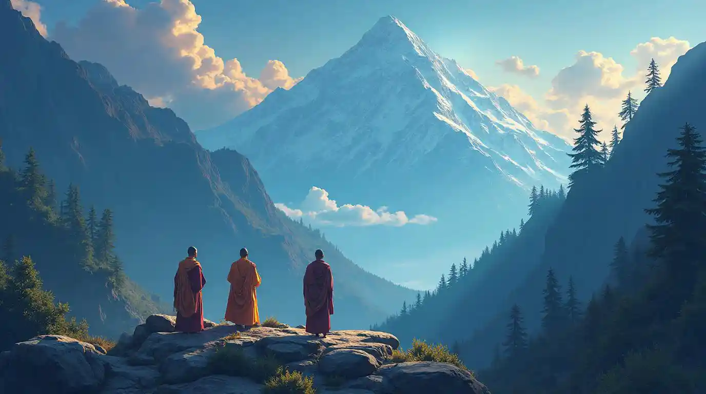 Mountain monastery, monks with elemental auras, echoing serene and powerful anime visuals.