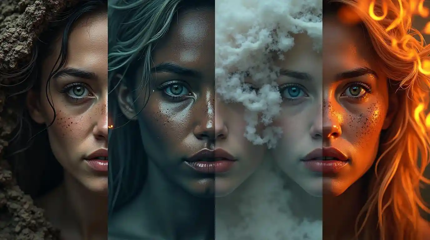 A fine art portrait of a woman with a melancholic gaze, divided into four vertical segments. The leftmost part shows her skin textured as rough, cracked earth, with natural soil patterns defining her features. Next, her skin appears as flowing water, with waves and droplets reflecting light, creating a serene, fluid effect. The third section presents her skin as airy and cloud-like, with soft, swirling mist blending into her face, giving an ethereal, otherworldly look. The rightmost part transforms her skin into fiery textures, with embers glowing subtly to highlight her contours. The artwork aims for a realistic, dramatic visual impact