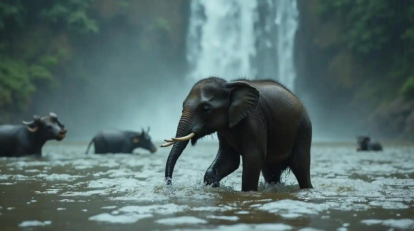 The baby elephant's energy is failing. Its trunk barely rises above the water now, and its small legs kick weakly. Rain pours heavily, making visibility poor. The waterfall looms closer, its roaring sound deafening. The water buffalo on the riverbank stomp and snort, sensing the elephant's imminent danger. There are no humans in sight yet.