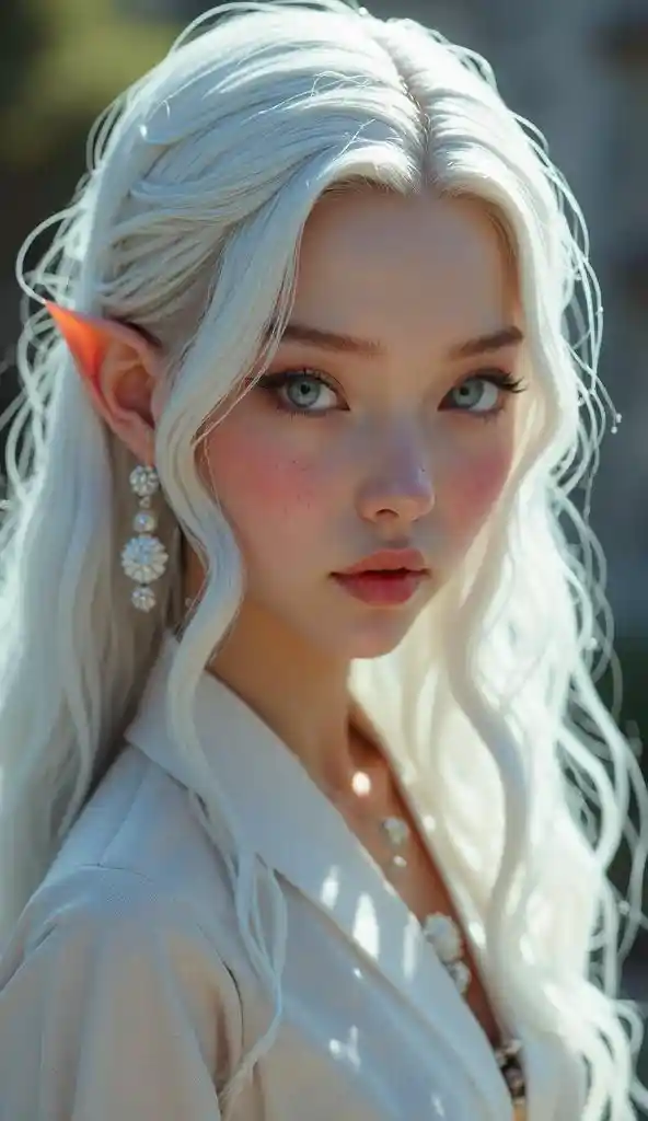 JacksonSuperb quality, 8K, Portrait Detail, Realistic, photorealistic, 하이Elf, Elf, Modern World , 아름다운 가슴을 가진 미소녀 Elf, silver hair, delicate facial features, Natural P