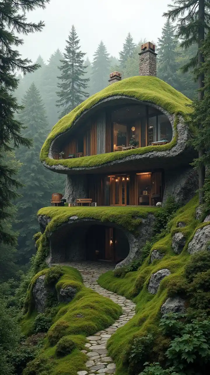 Modern_Elfin_house_on_a forest hillside:: two_levels, partially_submerged into_the_hill:: biomorphic architecture:: Earth roof with lawn:: facades _with_superlarge_windows:: elfin medieval motifs of decoration and architecture:: an_awe-inspiring_art_scene filled_with_feelings_of_tranquility_nostalgia_comfort::