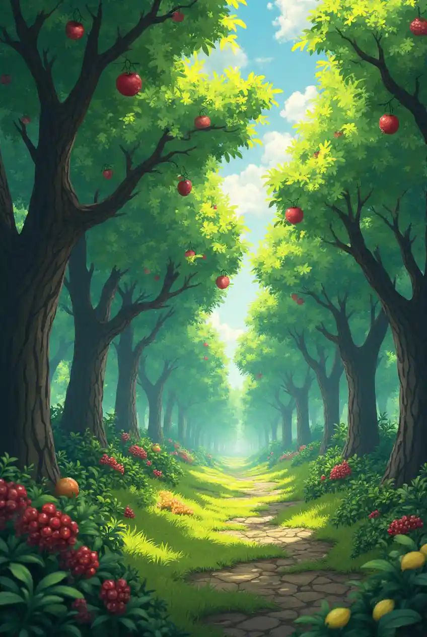 Lush orchard, fruit granting mystical abilities, akin to magic-infused anime settings.