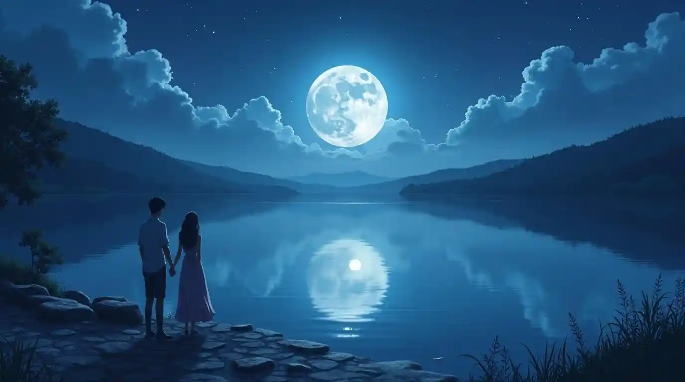 Ethereal lakeside, moonlit dance of spirits, reflecting romantic supernatural anime.