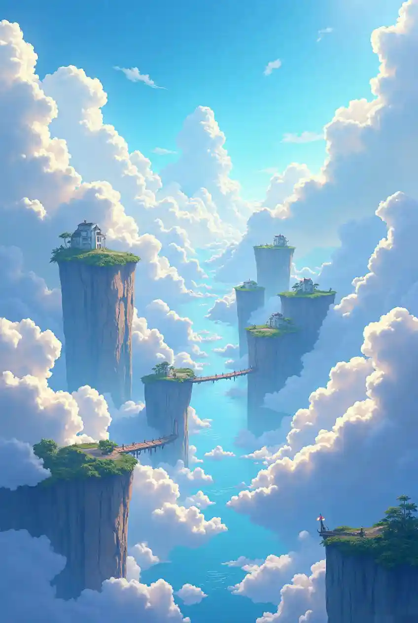 Ethereal realm with floating islands, bridges connecting clouds, mirroring dreamy anime visuals.