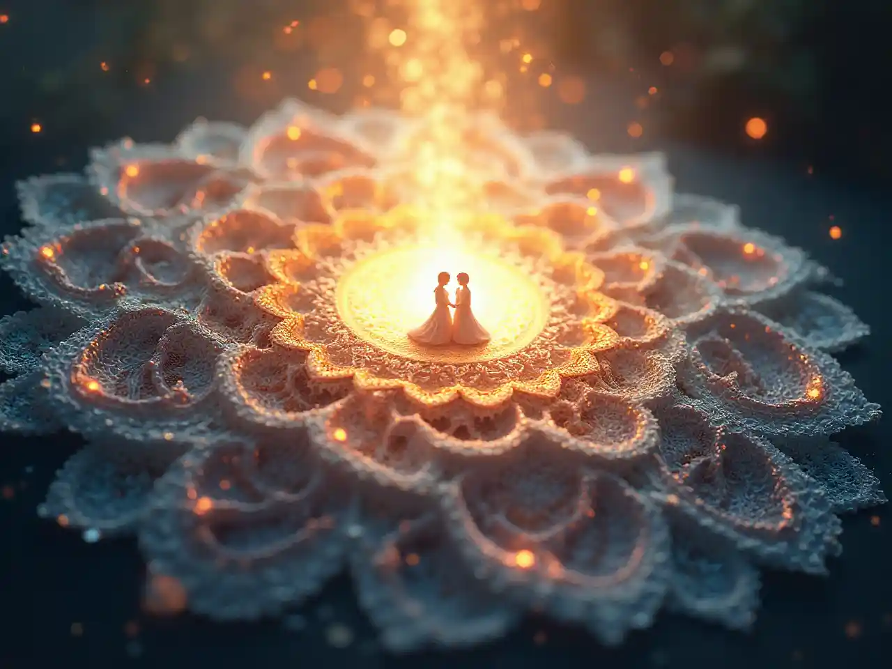 Create an artwork that evokes both intimacy and otherworldliness, immersing the viewer in a transcendent, emotional experience. Lighting and Exposure: Luminous, radiant glow from the center; soft, golden-hour lighting; ethereal light leaks. Texture and Surface: Ornate fractals; swirling lace-like patterns; baroque filigree; intricate floral details; fine embroidery-like textures. Color and Tone: Harmonious polychromatic palette; soft golds, pastel pinks, icy blues; pearlescent whites; iridescent highlights. Composition and Perspective: Centered mandala-like structure symbolizing unity; patterns spiraling into a starry background suggesting infinite possibilities. Camera Angle: Aerial, bird’s-eye view capturing intricate symmetry and flow. Subject Focus: Two abstract, semi-transparent figures in a fluid, dance-like pose at the mandala's heart, representing giving and receiving. Additional Effects: Cascading light particles, shimmering stardust, subtle motion blur in fractal spirals for dynamic flow and evolution.
