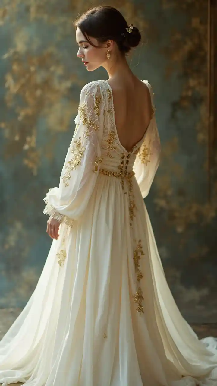 A (((Jarek Kubicki and Margaret Macdonald Mackintosh's delicate and elegant style))).. HEMS OF ETHEREAL GOLDEN STITCHING OVER A WHITE SATIN GOWN. SHE'S THE LADY OF FASHION