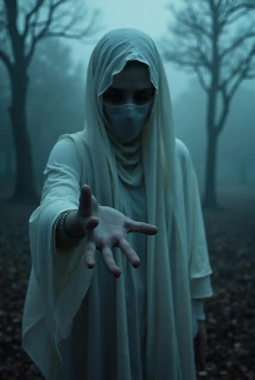 transparent ghostly woman, fading, misty, ethereal ghost, ((extending hand to viewer)), scary cemetery, gloomy foggy night