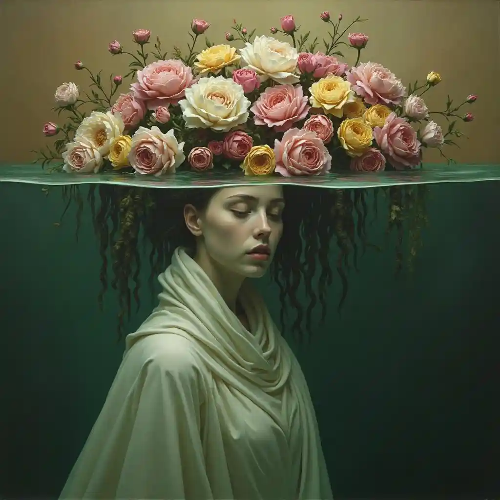 A mystical and surreal Artheon-style painting showcases a transcendent moment of a woman submerged in water. The ethereal figure, adorned in a flowing white shroud, has her head slightly above the water, with her eyes closed and an enigmatic expression. Her translucent skin contrasts with the vibrant, floating bouquet of pink, yellow, and white flowers, which are entwined with dark green tendrils of seaweed-like material descending into the depths. The muted, earthy brown background and the deep green water create an atmospheric backdrop that intensifies the haunting beauty of the scene.
