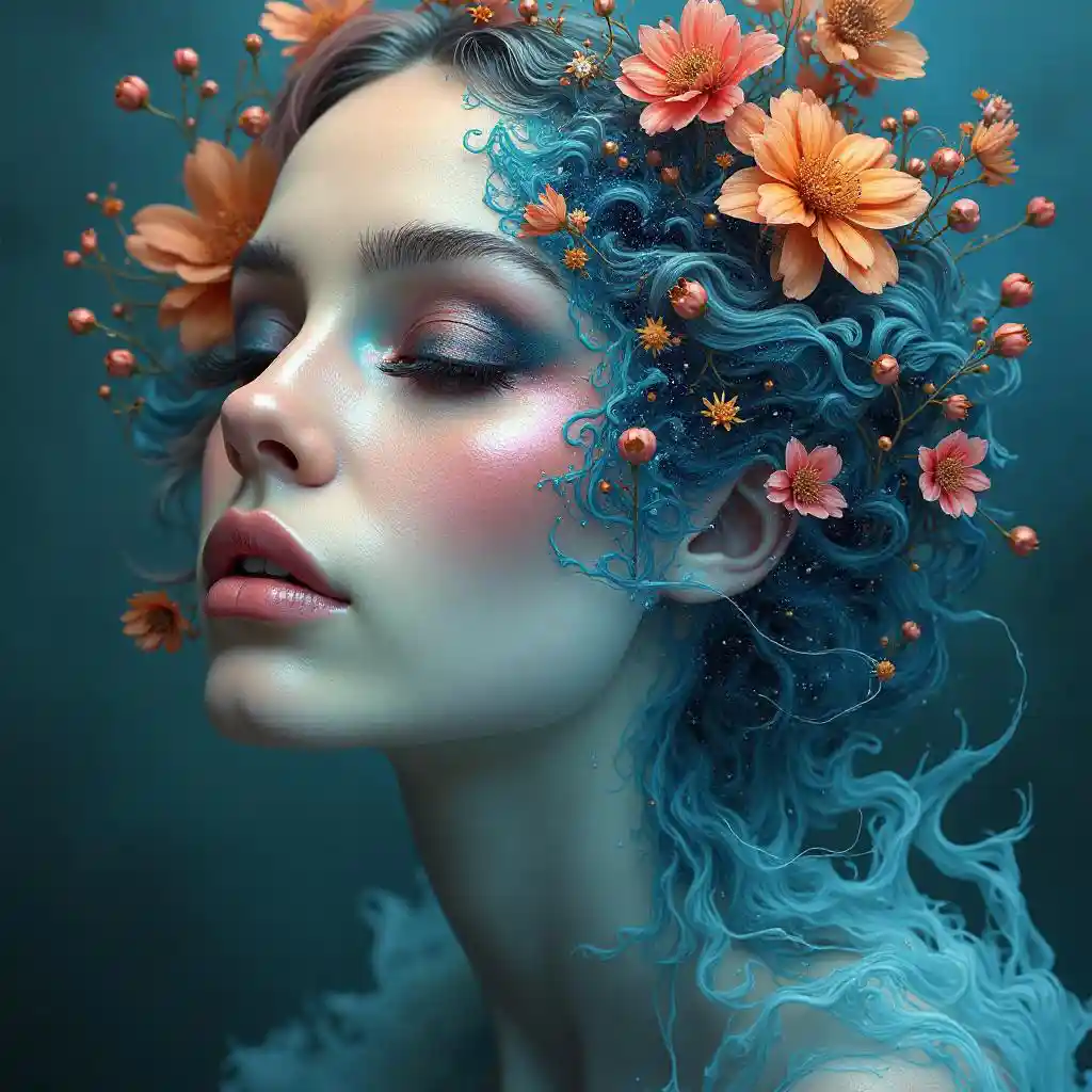 Create a surreal portrait of a woman with fluid and dreamlike features. Her face is a blend of organic and abstract elements: one side of her face morphs into flowing water, while the other is interwoven with vibrant flowers and twisted vines. Her eyes are like deep galaxies, reflecting the cosmos, and her hair transforms into swirling smoke, fading into the background. The colors shift unexpectedly, creating a sense of mystery and wonder. The overall atmosphere is ethereal, with a juxtaposition of beauty and the surreal that captivates the viewer.