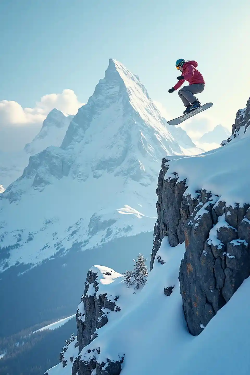 LeilaA high mountain with lots of snow,A steep slope like a cliff,A woman showcasing difficult aerial snowboarding techniques,4K,8K,high resolution,masterpiece,ultra