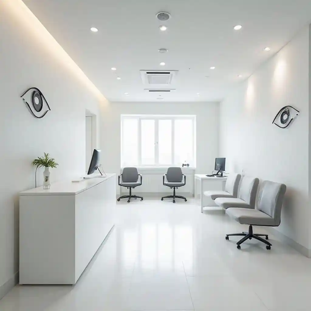 "A small, minimalist ophthalmology clinic with a bright waiting area, sleek reception desk, and a few patient chairs. Recessed LED lights ensure ample brightness. A compact examination room features essential eye-testing equipment and a clean office desk. White walls with subtle eye-themed accents create a calm, professional vibe."