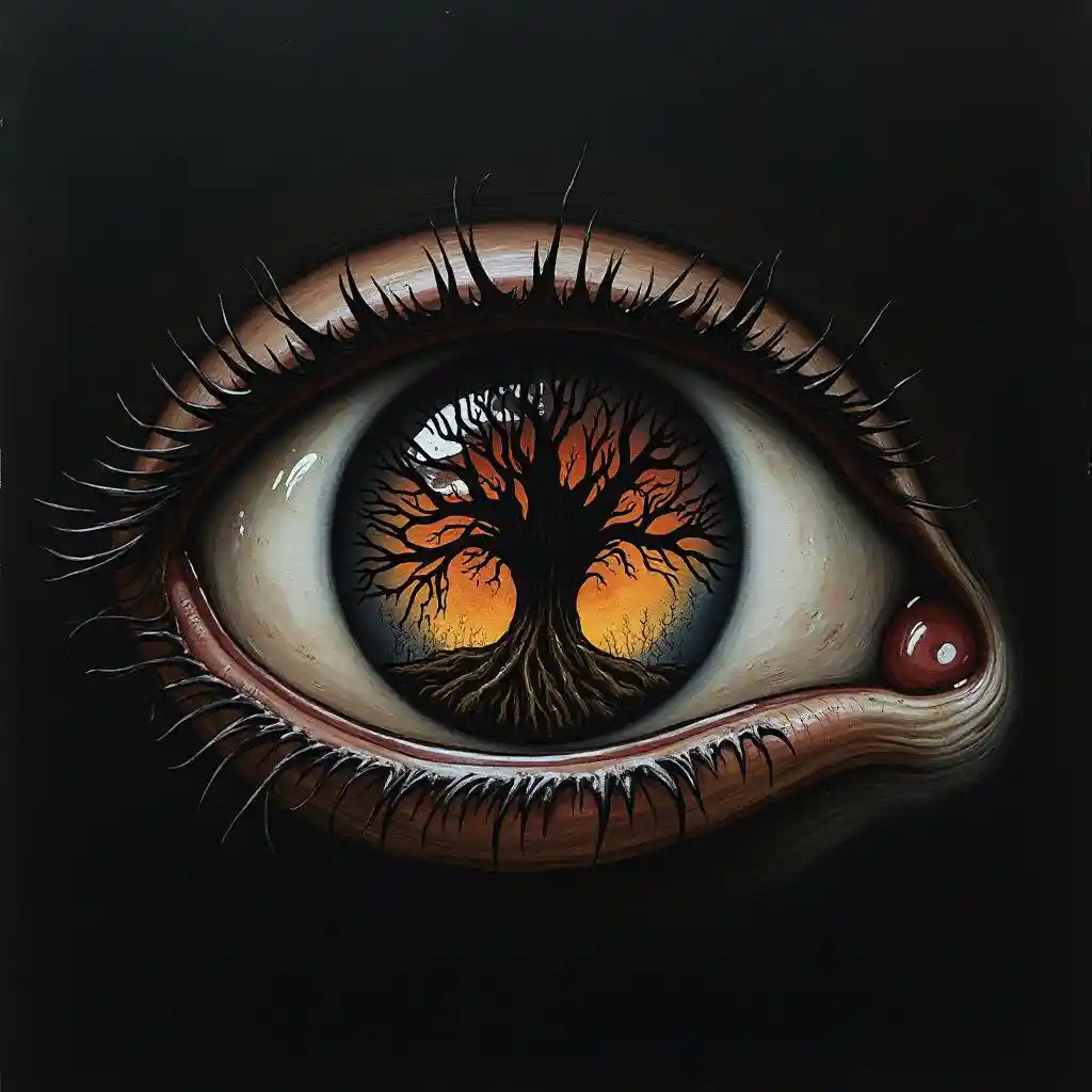 SebastianDraw a human eye with black background and with brown pupils and inside this eye draw a scary tree full of eyes and autumn atmosphere.
