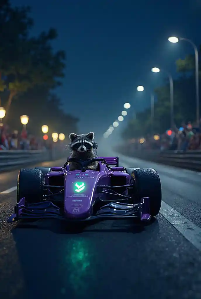 Elijahwide angle, overall plan, F1 Midnight race, ((, the raccoon drives a purple F1 car with green LEDs)), ((, the capybara drives a black F1 car with yellow LEDs))