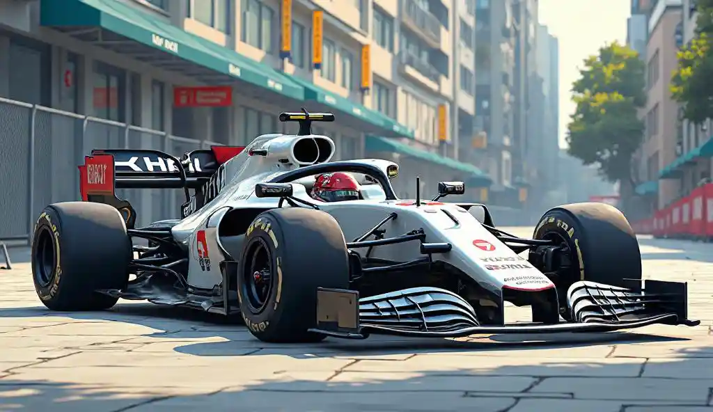 EastonF1 illustration, the design of the F1 car is a "panda" design, (the upper half of the body is white and the lower half is black). The car is parked in an urban
