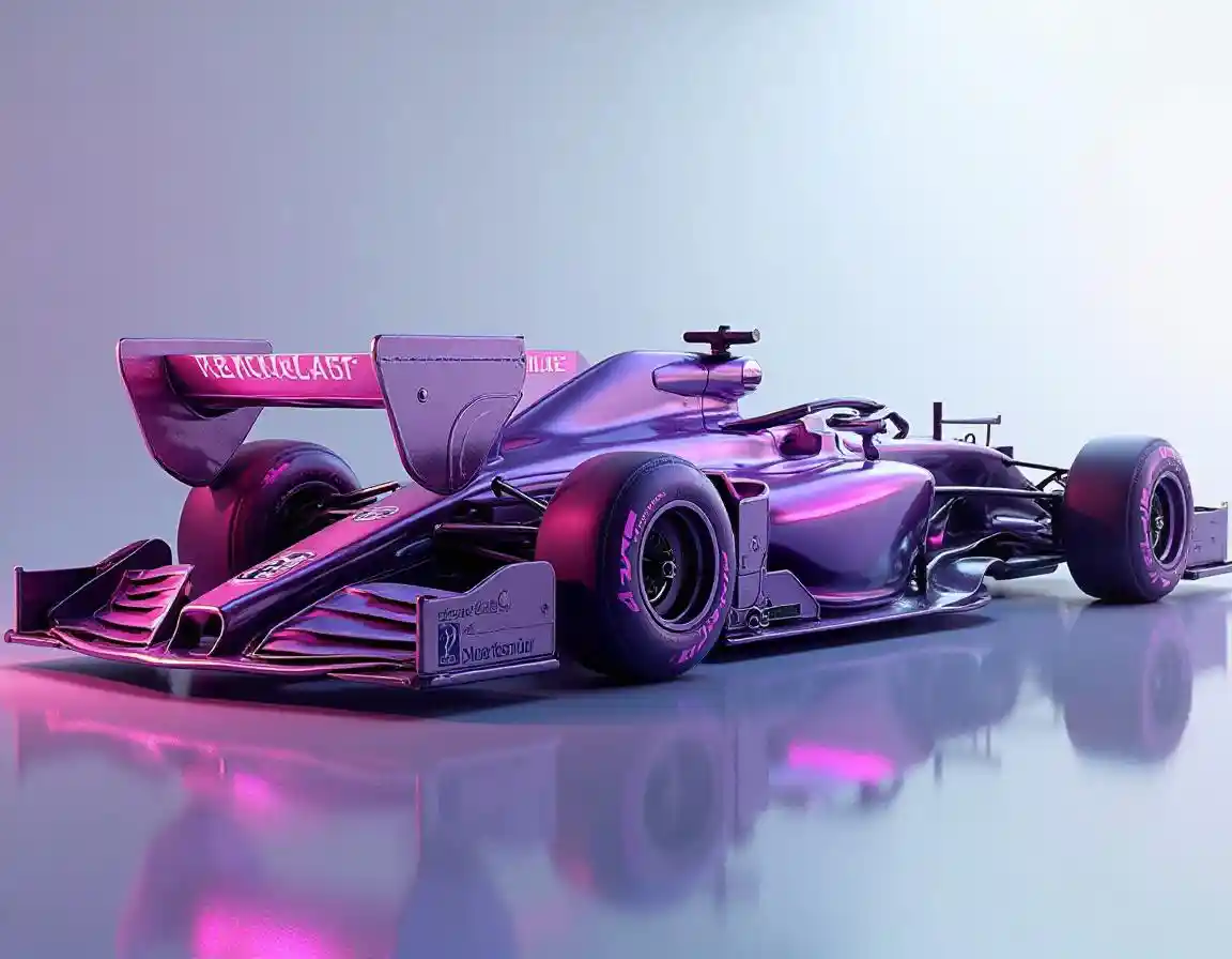 KinsleyA futuristic purple and pink Formula 1 racing car, metallic reflections ,