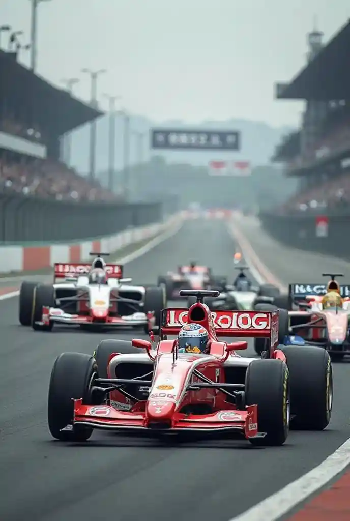 ((最高品質)), ((傑作)), ( 詳細), Formula One cars racing around Suzuka Circuit, their red and white bodies decorating the circuit,