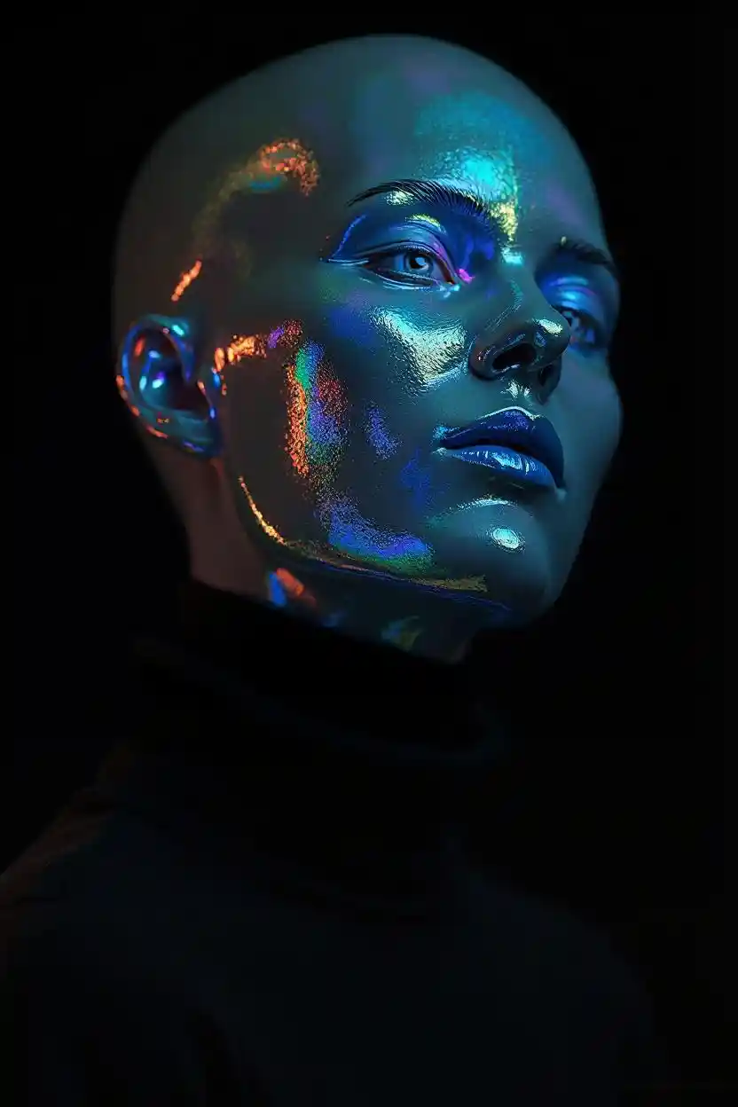 close up of an iridescent faceless silhouette, surreal eerie fantasy, fashion model with black turtleneck, black background