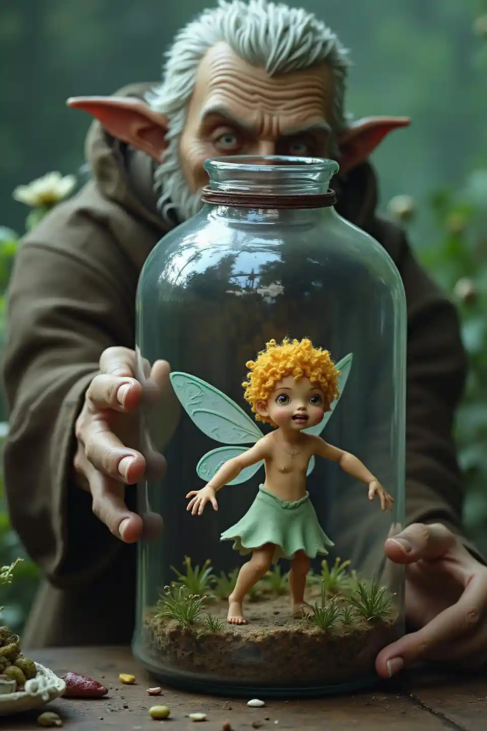 A tiny fairy locked inside a glass jar, fearful. While out there, a man with an evil attitude sees her with greed