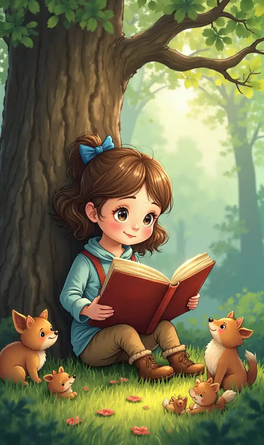 a curious young girl with big sparkling eyes, reading a large picture book under a tree, surrounded by forest animals, cozy fairytale style illustration, crayon