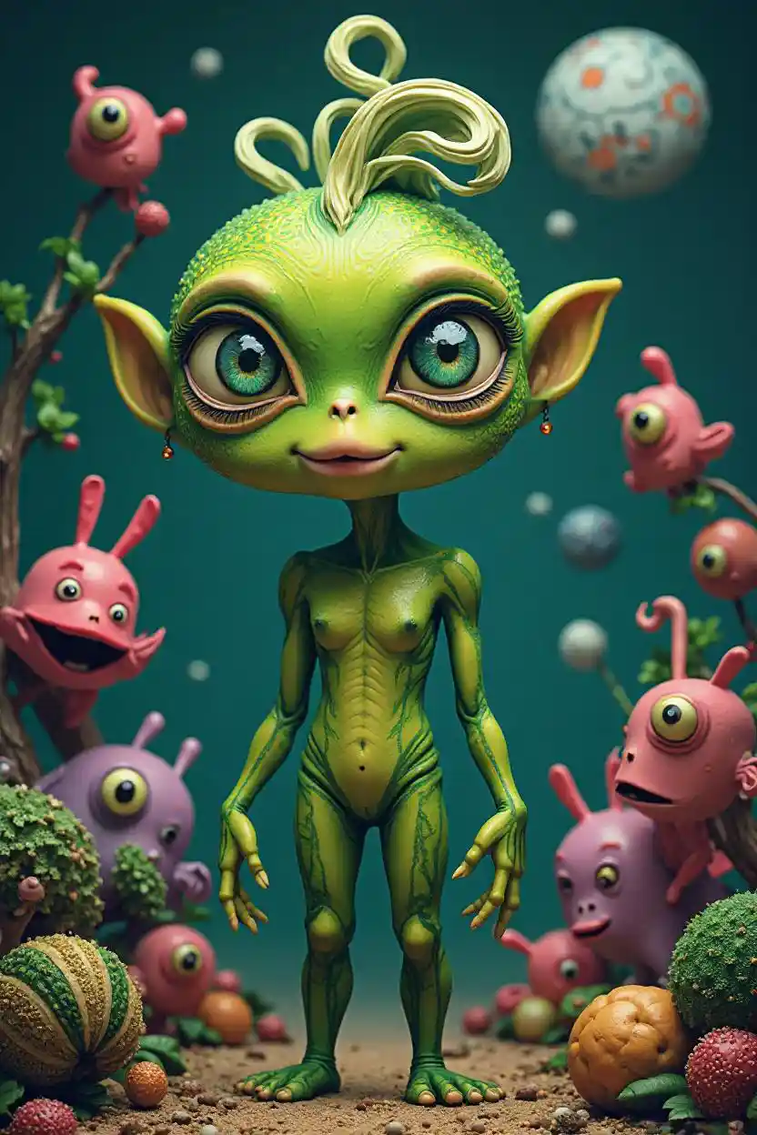 Elsagreen alien lady and surreal cute creatures full of fantasy in the magic world, insane, bold colors