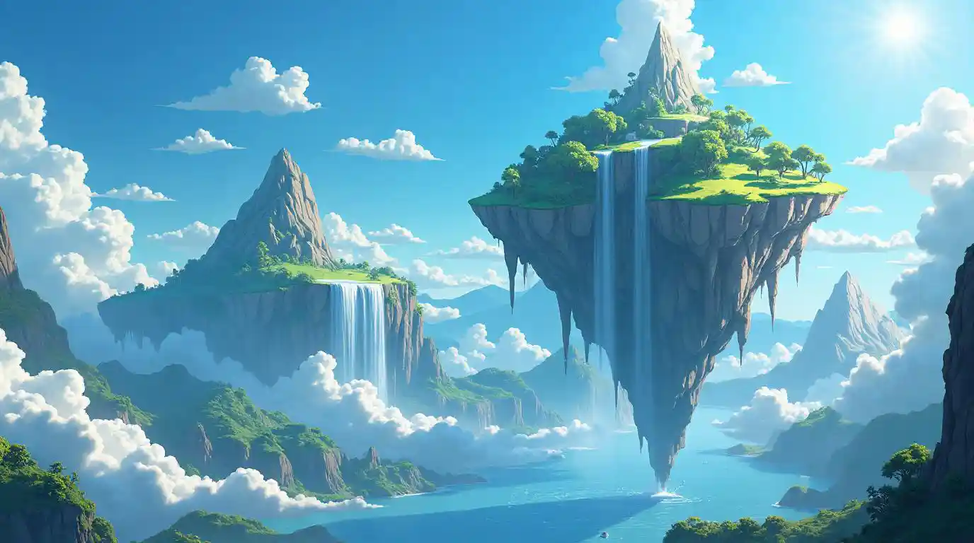 Floating islands and gravity-defying waterfalls, akin to a fantasy anime setting.