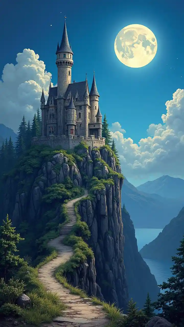A Surreal Castle Under the Full Moon Sky