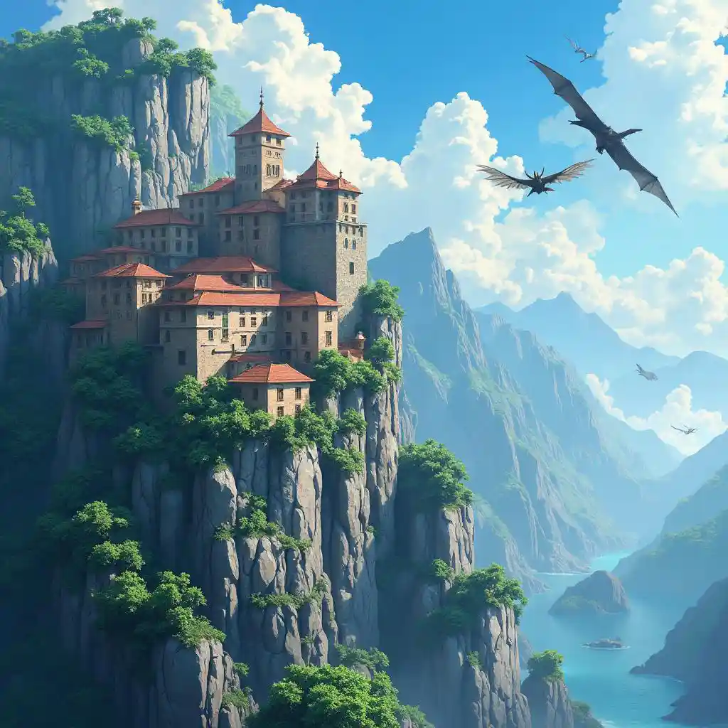 Cliffside village, aerial views of soaring dragons, channeling high-fantasy anime aesthetics.