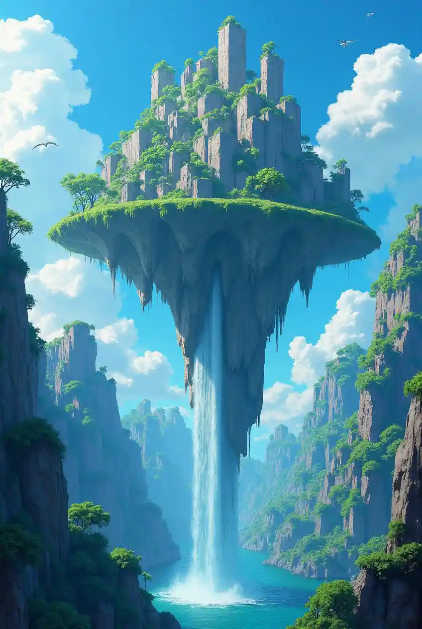 Floating islands and gravity-defying waterfalls, akin to a fantasy anime setting.