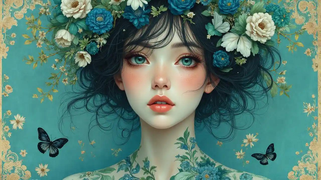 breathtaking Female Portrait by Miho Hirano, ilya kuvshinov, alphonse mucha, realistic, detailed, blue, green tonalities, beautiful collage technique including flora, branches, birds, butterflies, ornate background, beautiful Fantasy detailed trending on artstation, oil painting,Dramatic lighting, ethereal , high quality print, fine art with subtle redshift rendering