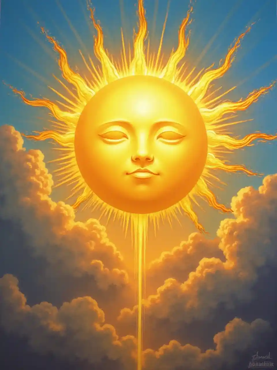 Enchanted Sun: A Fantastical Radiant Portrait in Blue Sky