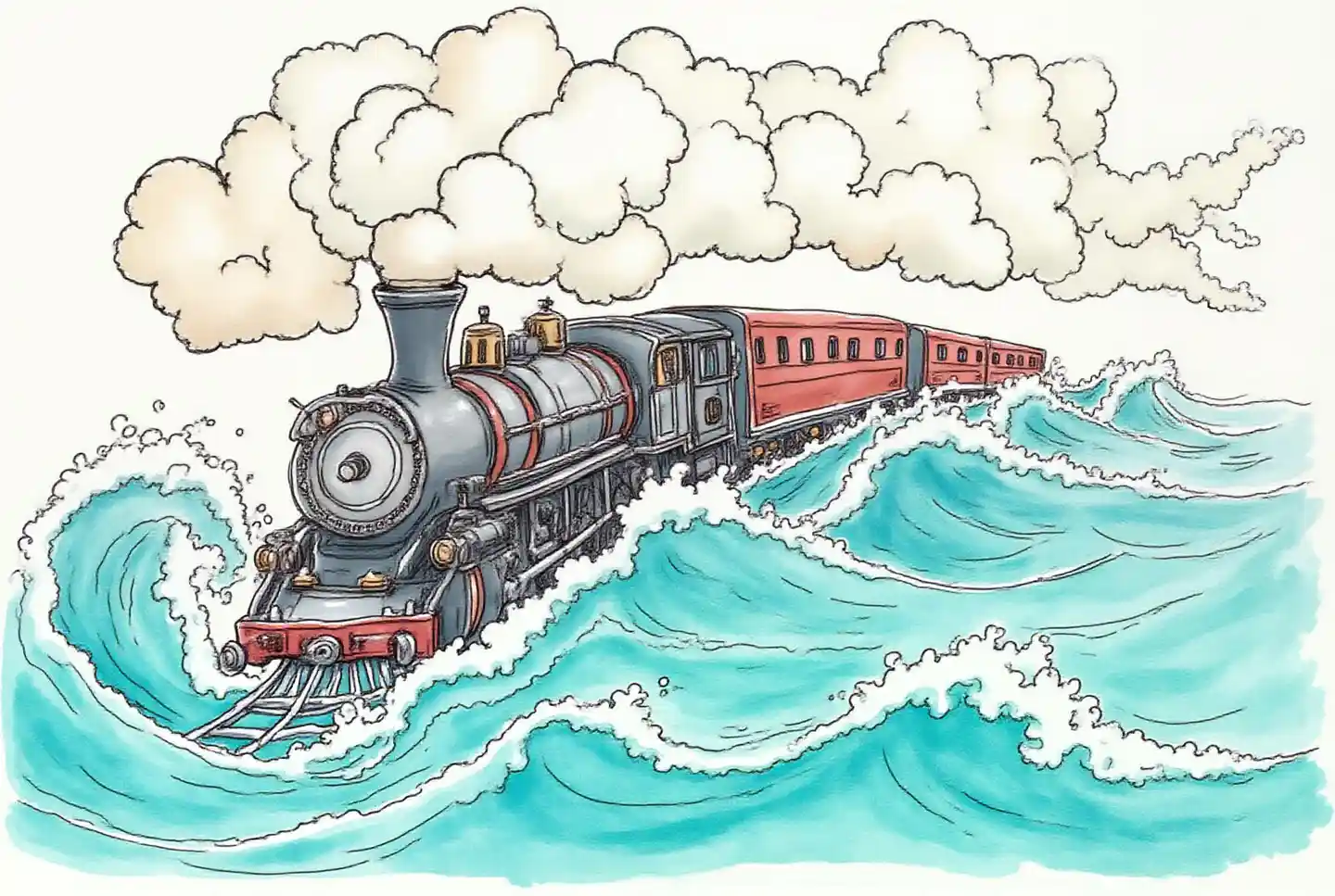 Whimsical watercolor illustration with bold hand-drawn outlines, a steam locomotive bursts through cotton-candy clouds, plummeting toward turquoise waves where