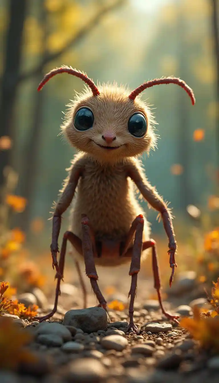 Villain、walk on an ant's back、friendly expression、short、Curious、Strong sense of exploration、4K、photorealistic、HRD、bright colors、Bokeh、Fantasy Scenes、masterpiece
