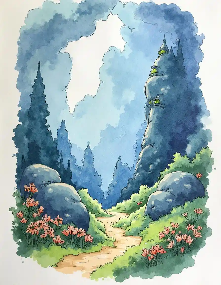 rubylynhand-painted fantasy world、 watercolor smudge 、Thick contoured 、daily、Picture book page 1、hand drawn, watercolor smudges, thick outline, daily, fantasy scene, u