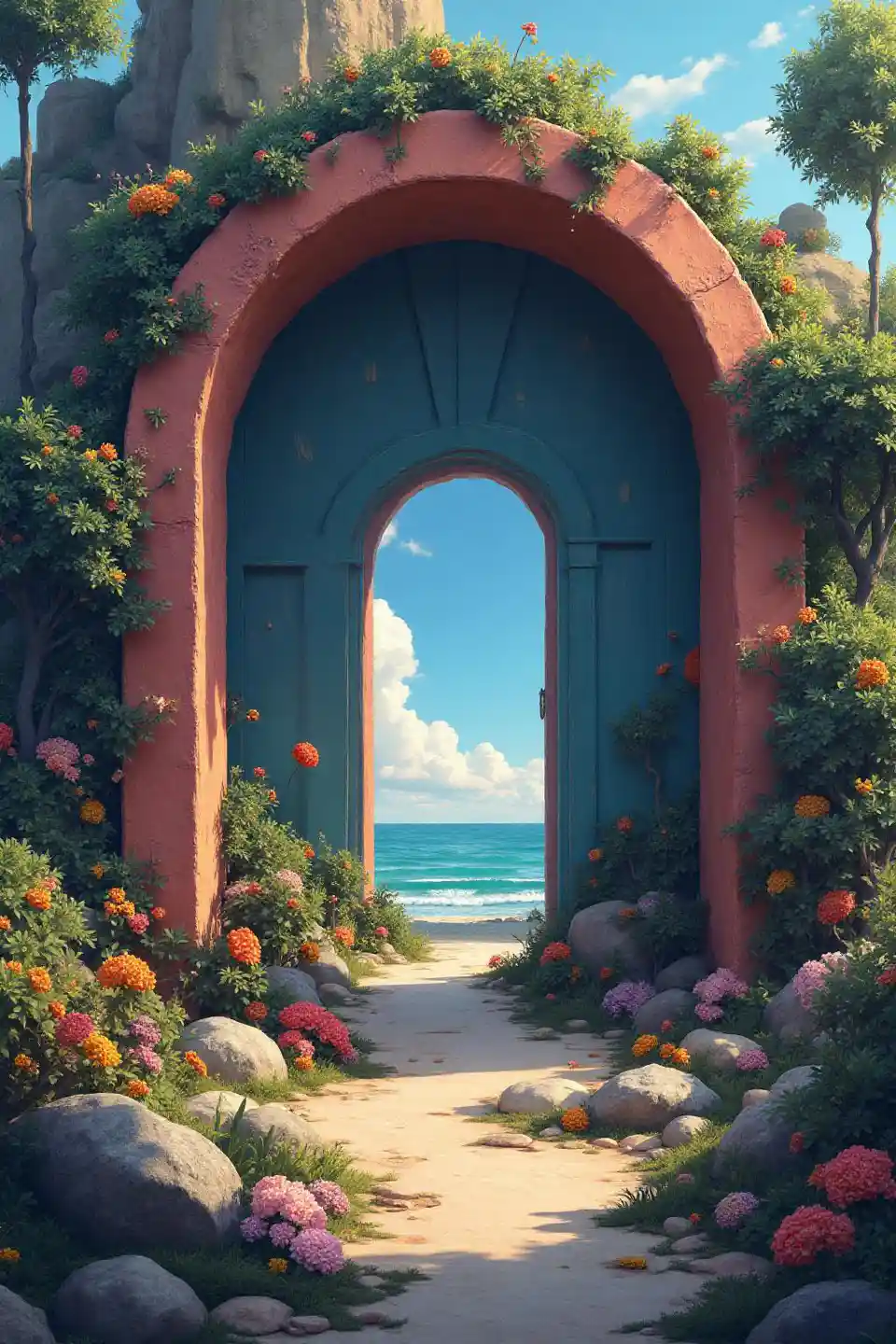 A colorful and unimaginable planet, A mobile door that allows you to move far and wide at once, A home where everything is in harmony with nature, precise descr
