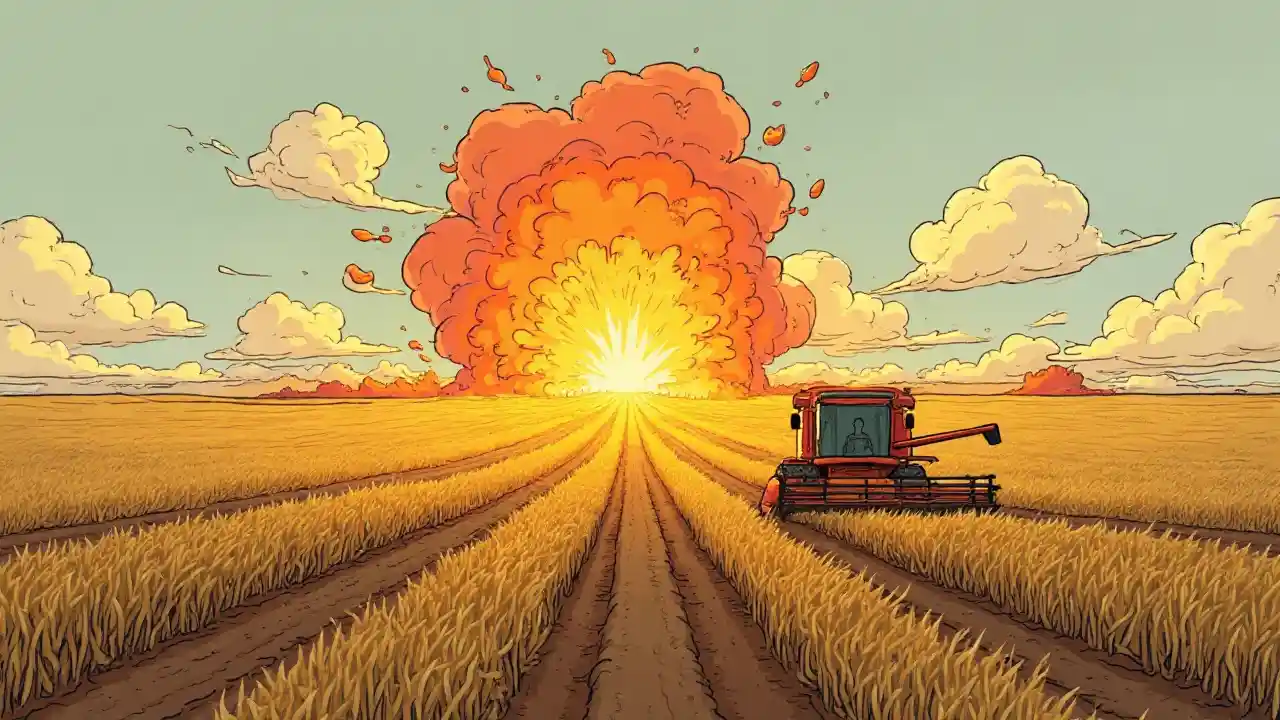 BentleyDraw farm field with a large, fiery explosion in the background.